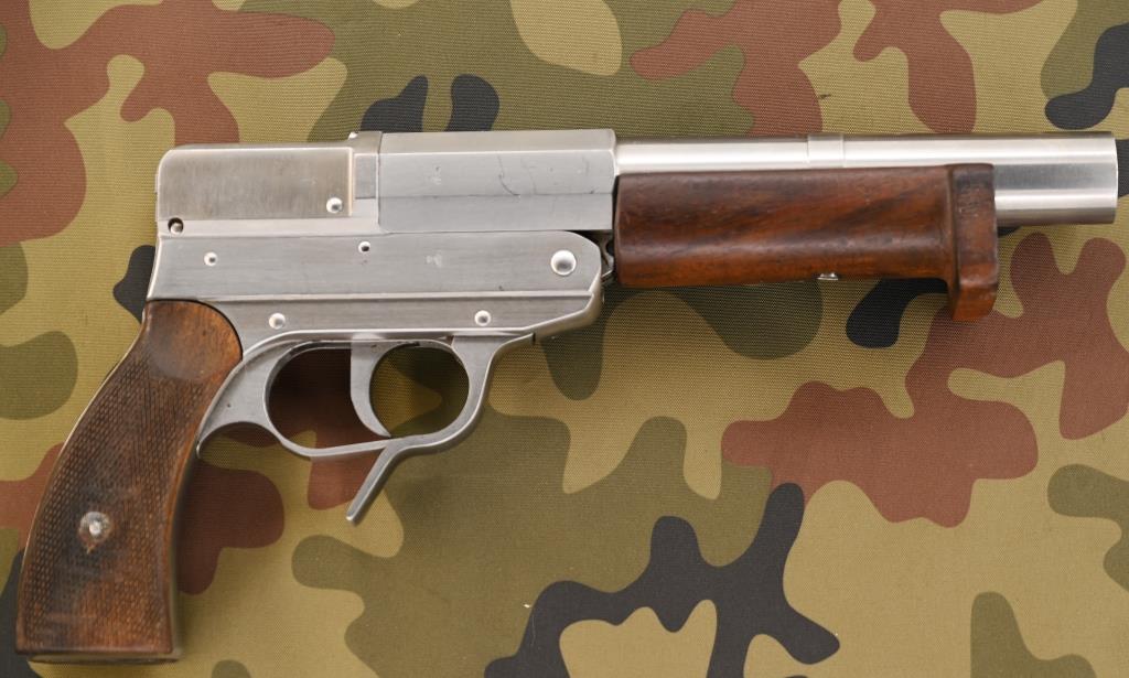 Sehr gut erhaltene Behelfsleuchtpistole, gefertigt auf Basis eines Karabiners 98k aus dem spanischen Waffenarsenal La Coruna, Baujahr 1957. Die sehr seltene Waffe gleicht dem deutschen